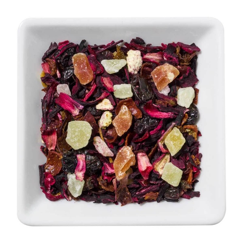Amestec exotic cu flori de hibiscus, macese, struguri, ananas confiat, papaya si bucati de mango, imbogatit cu coaja de lamaie si arome de piersici.
