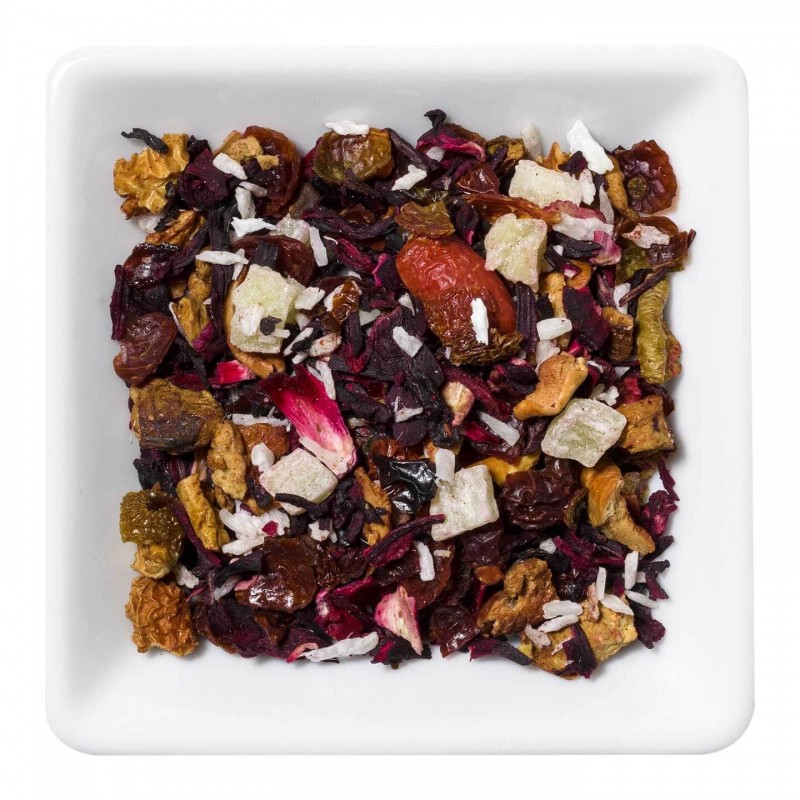 Hibiscus, coji de macese, bucati de mere, ananas, ananas, zahăr, nucă de cocos, aromă